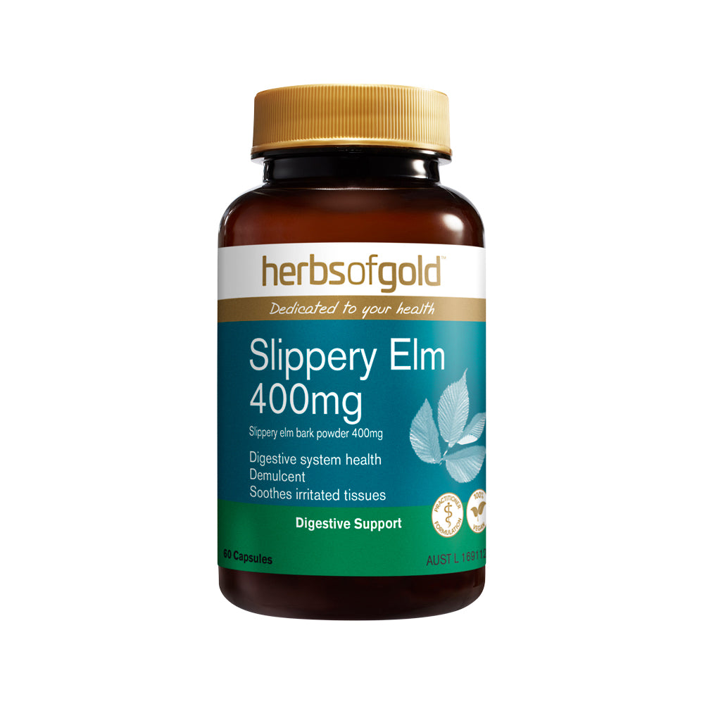 Herbs of Gold Slippery Elm 400mg supports digestive system health and healthy mucous linings of the digestive system.